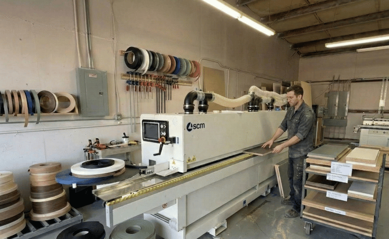 In humid climates like Houston, this is where cabinetry either holds up or starts to fail. We use industrial Italian SCM Group equipment together with PUR adhesive to create tightly sealed edges that block moisture and stay stable over time.